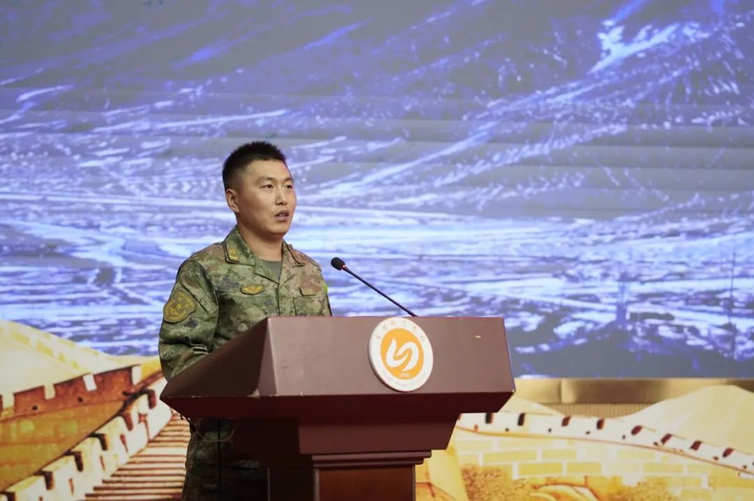 我校退伍士兵代表郑珊妮同学上台分享了自己的雪域戍边历程。对祖国的热爱促使她毅然选择参军,成为一名光荣的边防战士。她去到新疆的边远地区,去到海拔4500米的西藏阿里,去到前线雪地,困难艰苦没有使她退却,反而更令她明白爱国担当的切实分量。“只是因为祖国需要,我们便义无反顾。”赤诚的爱国热血令所有人肃然起敬。