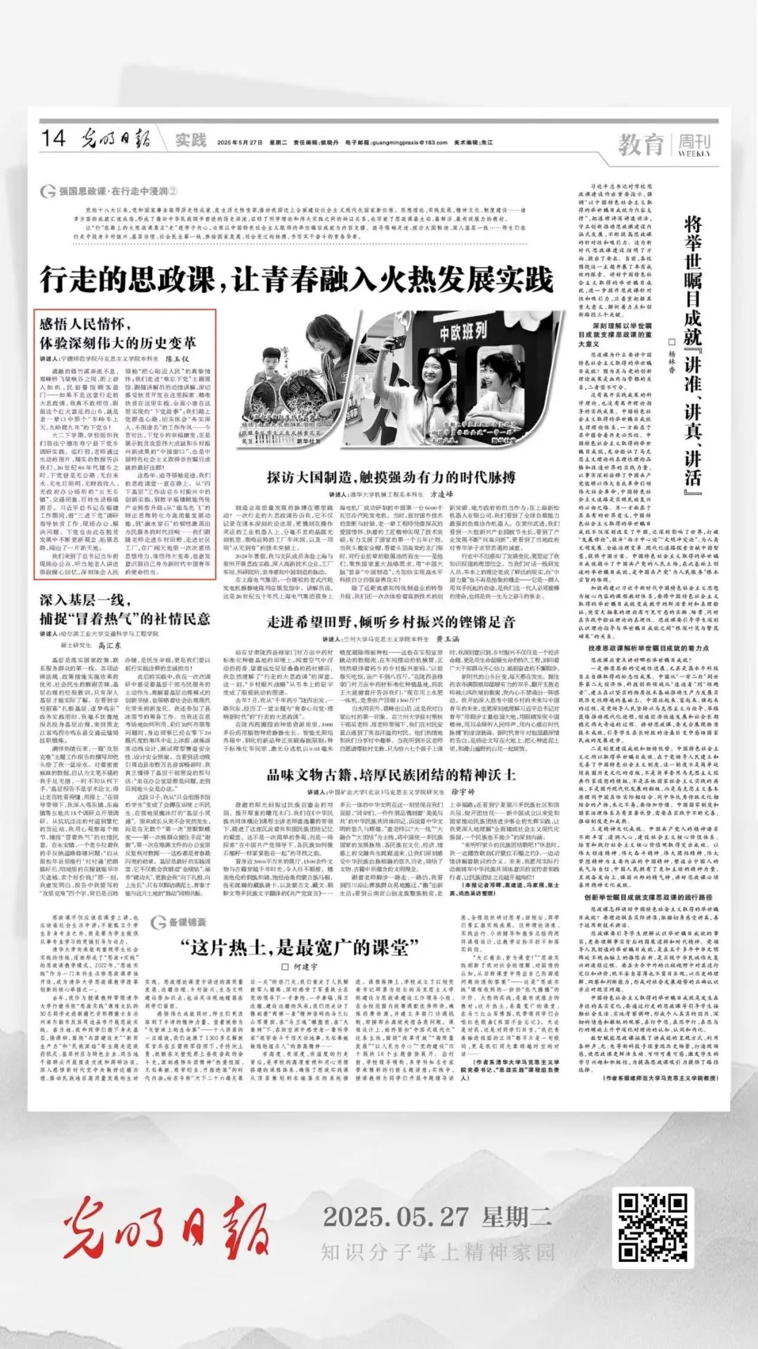 5月27日,《光明日报》教育版“行走的思政课,让青春融入火热发展实践”专题中刊发了我校马克思主义学院21级思想政治教育专业陈玉仪同学题为《感悟人民情怀,体验深刻伟大的历史变革》的实践感悟,生动展现了我校学子在思政实践中的深刻思考与青春担当。