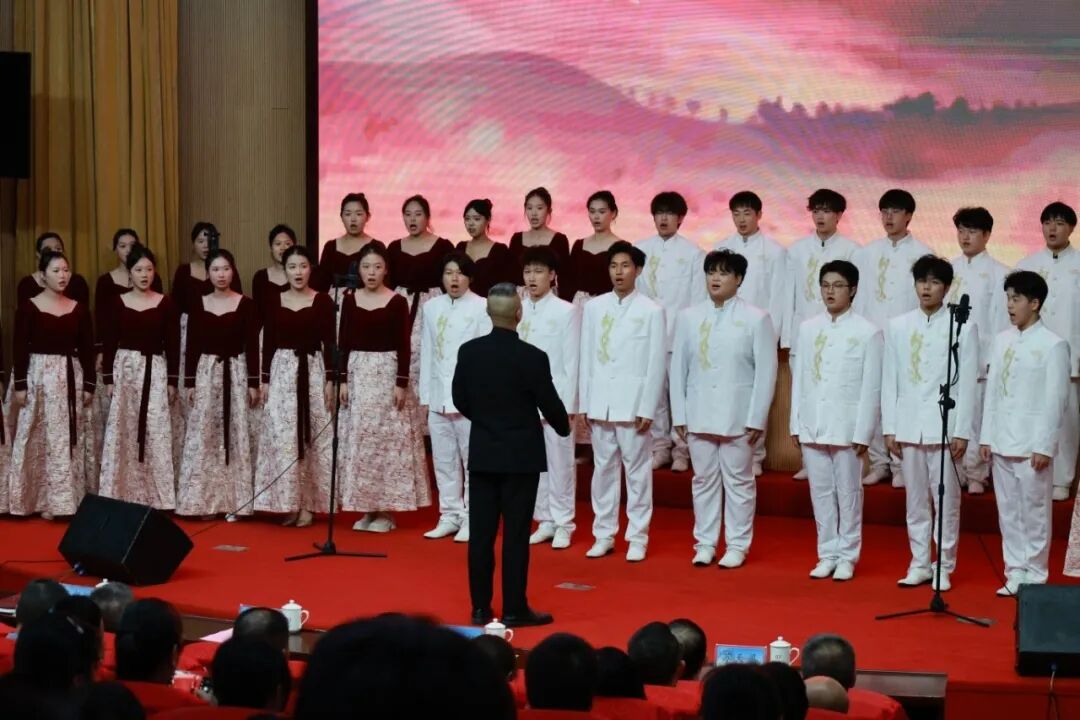 “风在吼,马在叫,黄河在咆哮!”教育学院音乐学专业学生在林东波教授的指挥下唱响《保卫黄河》,多声部轮唱、各声部交替推进如黄河奔涌,激昂的旋律在报告厅内回荡,全场师生不约而同加入合唱,唱出了对抗战岁月的深切铭记、对抗日英烈的崇高敬意,更唱响了新时代青年的热血担当。