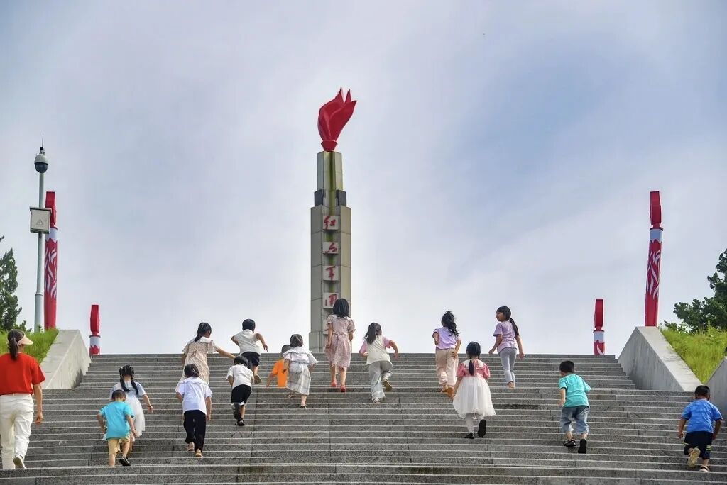 江西遂川,孩子们在大人的陪伴下,瞻仰红六军团长征先遣纪念碑。