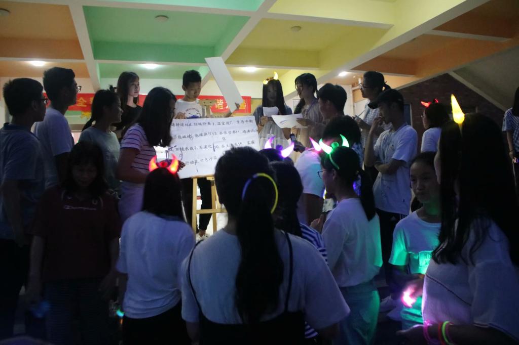 夜跑队伍的第一站是食堂。该点设定的游戏为“记环保,爱环境”,即将16个标有序号的与环保有关的词语乱序分布在白板上,参赛人员有一分钟的时间识记,并在十五秒之内复述出来。游戏开始之前,各队长都有条不紊的进行了战术安排,分配任务给每个队员,记忆对应词语;同时让完成记忆的同学快速腾出空间为其他人争取时间。每只队伍的同学们都十分认真地口诵心忆,均取得好成绩,其中“P”组的12名同学表现最为优异,引得其他队伍纷纷喝彩。本轮游戏让同学们在参与游戏的过程中,加深环保知识,提高同学们的保护环境的意识。