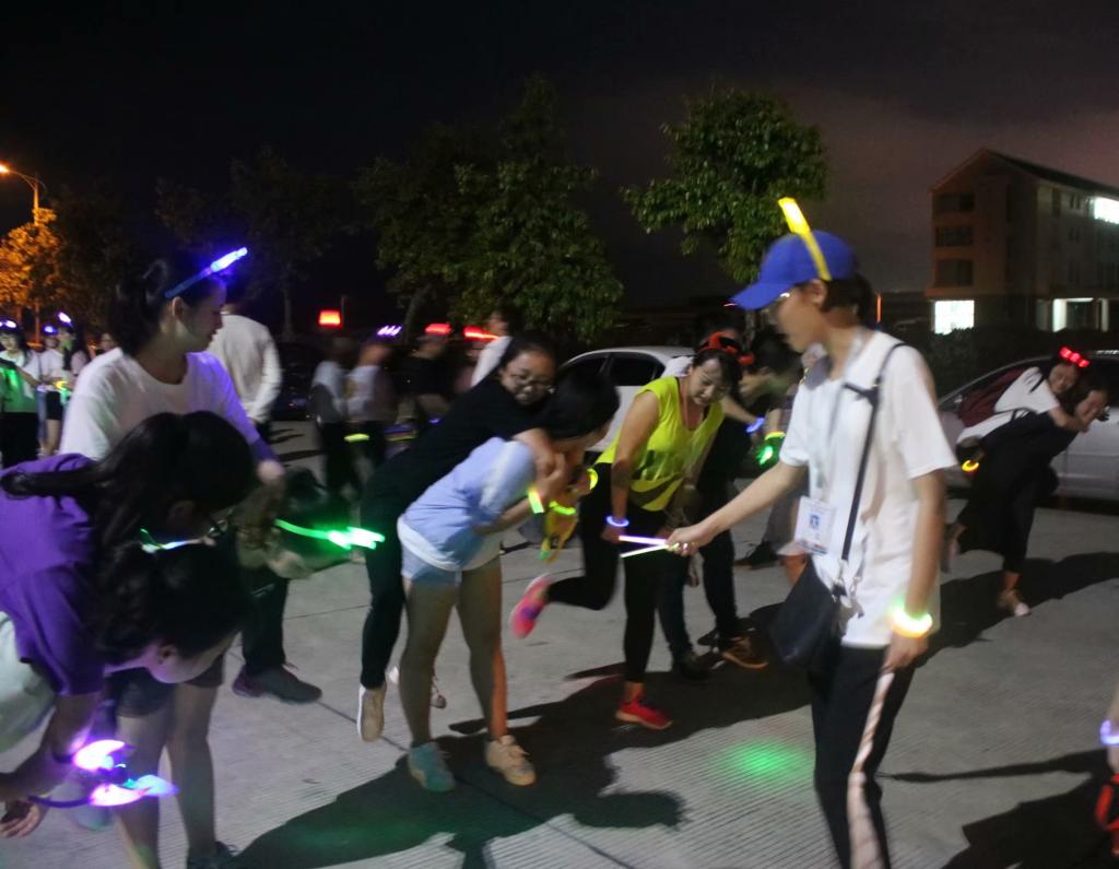 2018年6月8日晚,“绿色奔跑,保护地球”荧光夜跑活动于我校东侨校区顺利进行,来自各个学院的一百多名同学共同参与了本次活动。本次夜跑活动的参赛人员被分为了19支队伍,分别以“A”至“S” 19个字母命名。活动尚未开始,各支代表队伍已经整装待发,队伍中每个人头上都带着各式各样的闪光头饰,身上戴着各种颜色的荧光棒,在漆黑的夜晚中,形成了一道别具一格的荧光风景线。