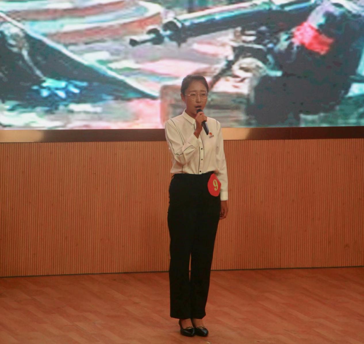 比赛如火如荼的进行中,9号选手19级马克思主义学院的张敏轩同学的演讲内容充实详细,在舞台上她正臂高呼着“强我国防,壮我国威”,声音在场内飘扬回荡。