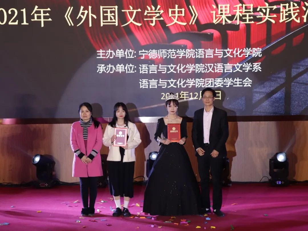 最后,《变色龙》组获得了一等奖;《后妈茶话会》组和《最后一片叶子》组获得了二等奖;《项链》组、《童话故事新编》组和《威尼斯商人》组获得了三等奖。