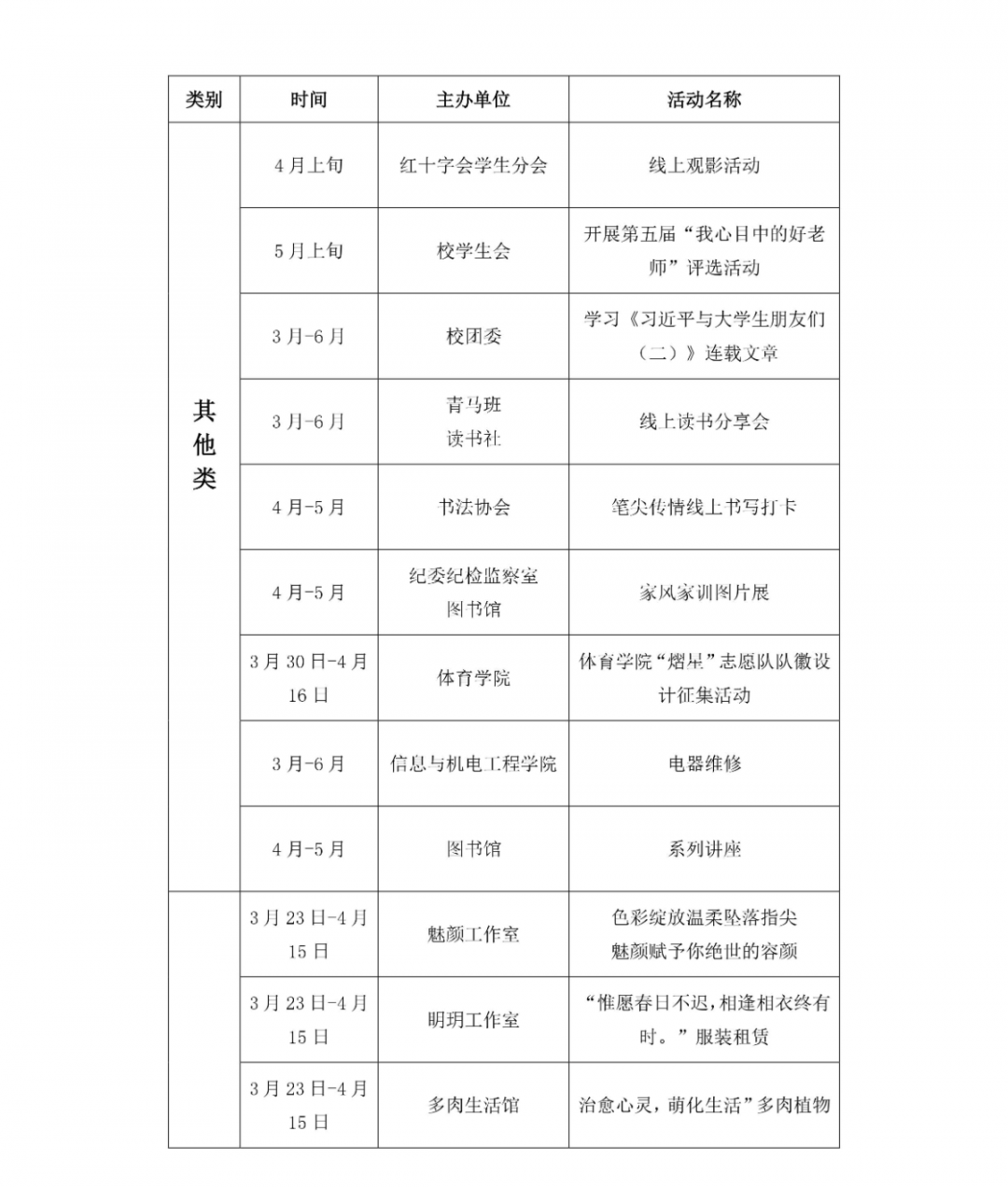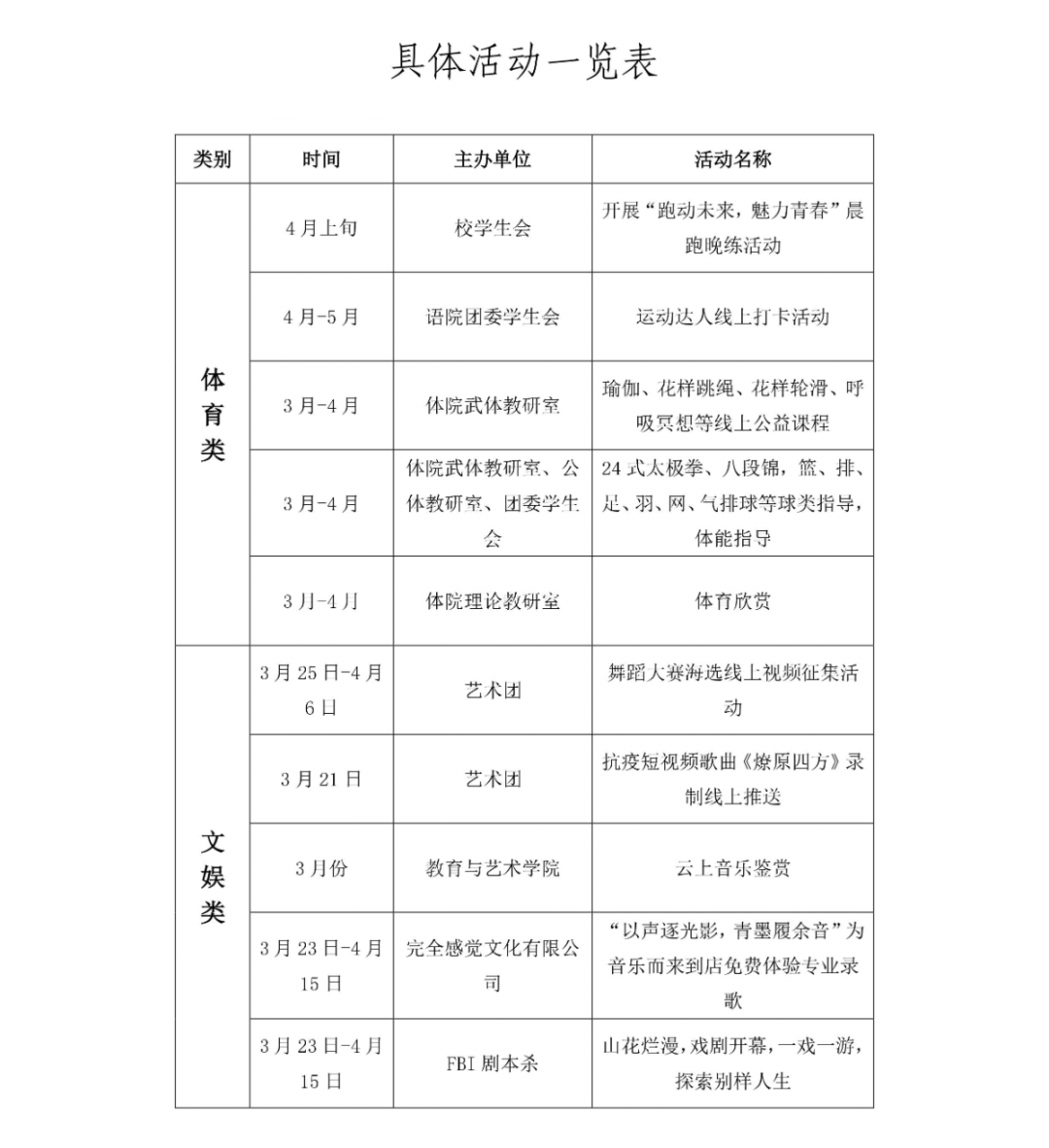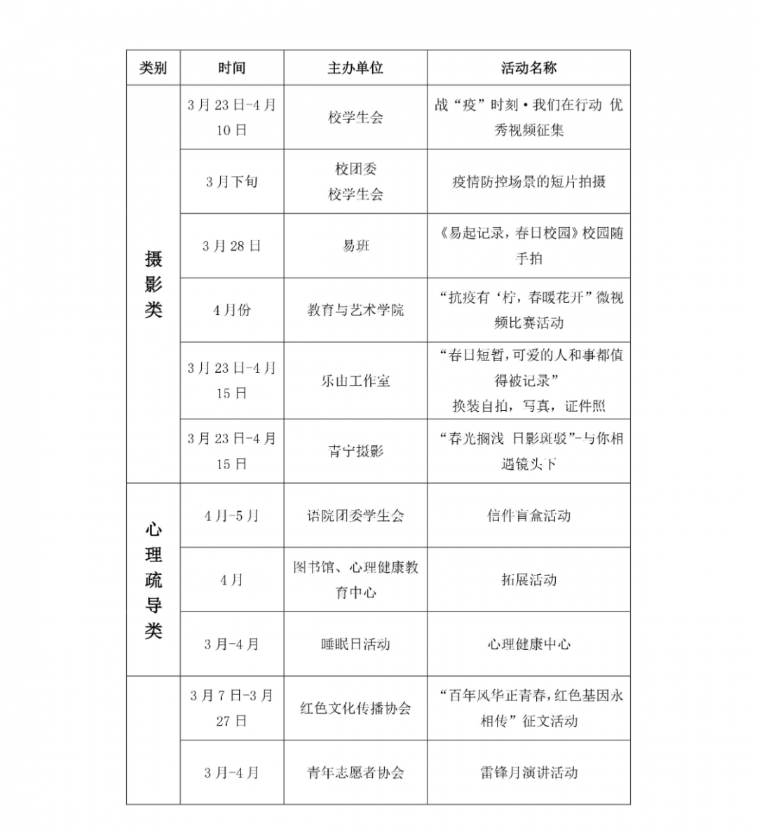 为丰富疫情期间大学生课余文化生活,纾解疫情给大学生带来的心理压力和焦虑情绪,让学生以更好的精神状态投入到学习和生活去中,经研究,决定开展系列校园文化活动。