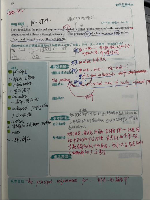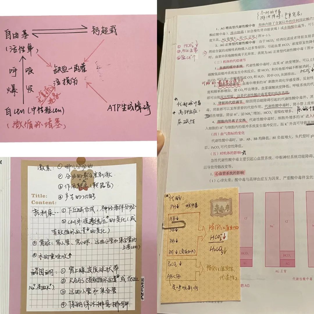 “可以用不同颜色的笔来区分重要内容,做笔记的时候心一定要静下来,可以去网上看看学习博主的vlog激励自己。”