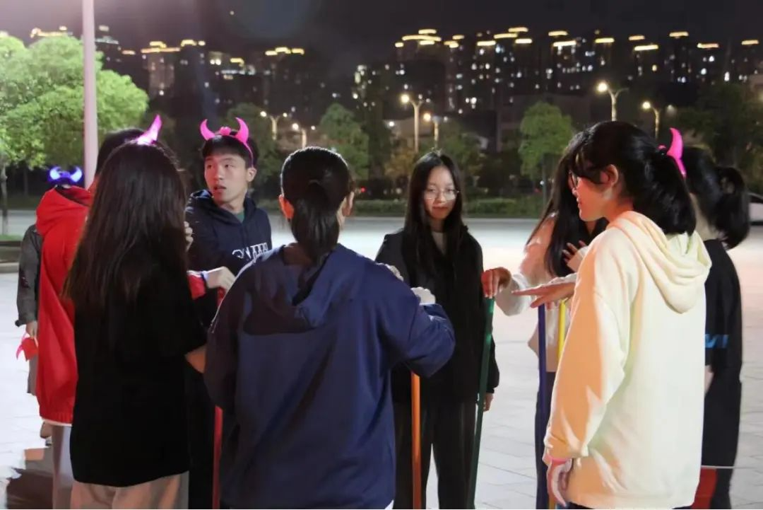 在结束第一关卡任务后,同学们继续前行。第二个关卡游戏是“不倒森林”,各小组成员围成一个圆,一只手压住塑料杆顶部,使其竖立。游戏开始,参与者朝一个方向移动,做到人动管不动。这个游戏考验了同学们的团队协作能力,调动了同学们的参与感与专注度,也促进了彼此间的友谊。游戏过程妙趣横生,现场气氛十分热烈。同学们手上的荧光手环连成了闪闪银河,照亮了夜晚的宁师。