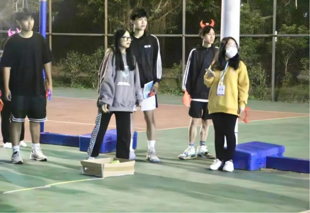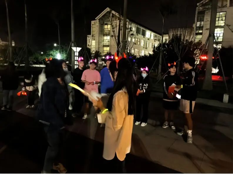 同学们在各组组长带领下,按照既定路线,抵达第一个关卡处。各组成员有序排成一列,指挥喊出“一二三,看这边”的口号时,参与者要同时将头偏向与指挥所指方向不同的方向。方向不一致,计一分;方向一致,则不计分。这个游戏考验同学们的思考能力和反应能力,也点燃了热烈的氛围。夜晚的宁师在同学们的欢声笑语中,洋溢着青春的气息。