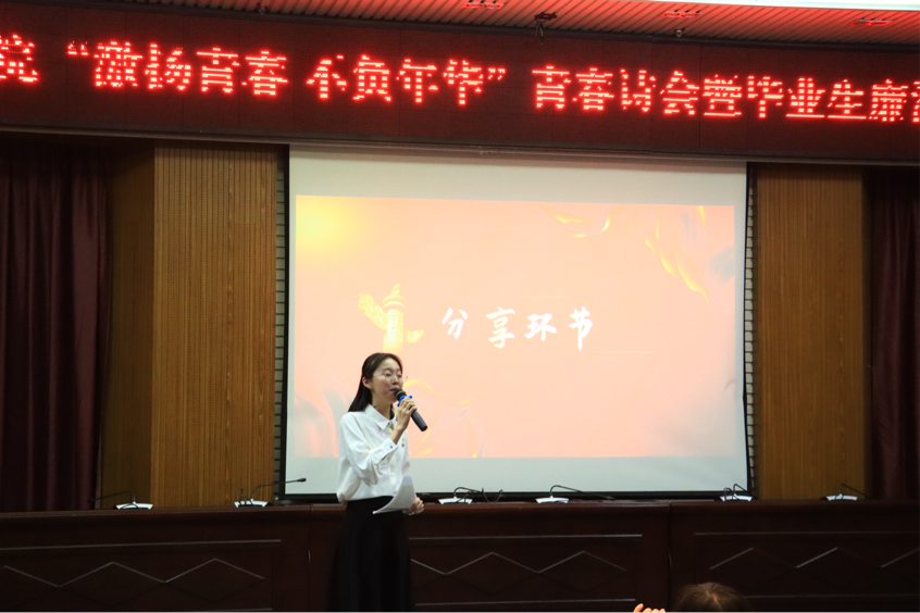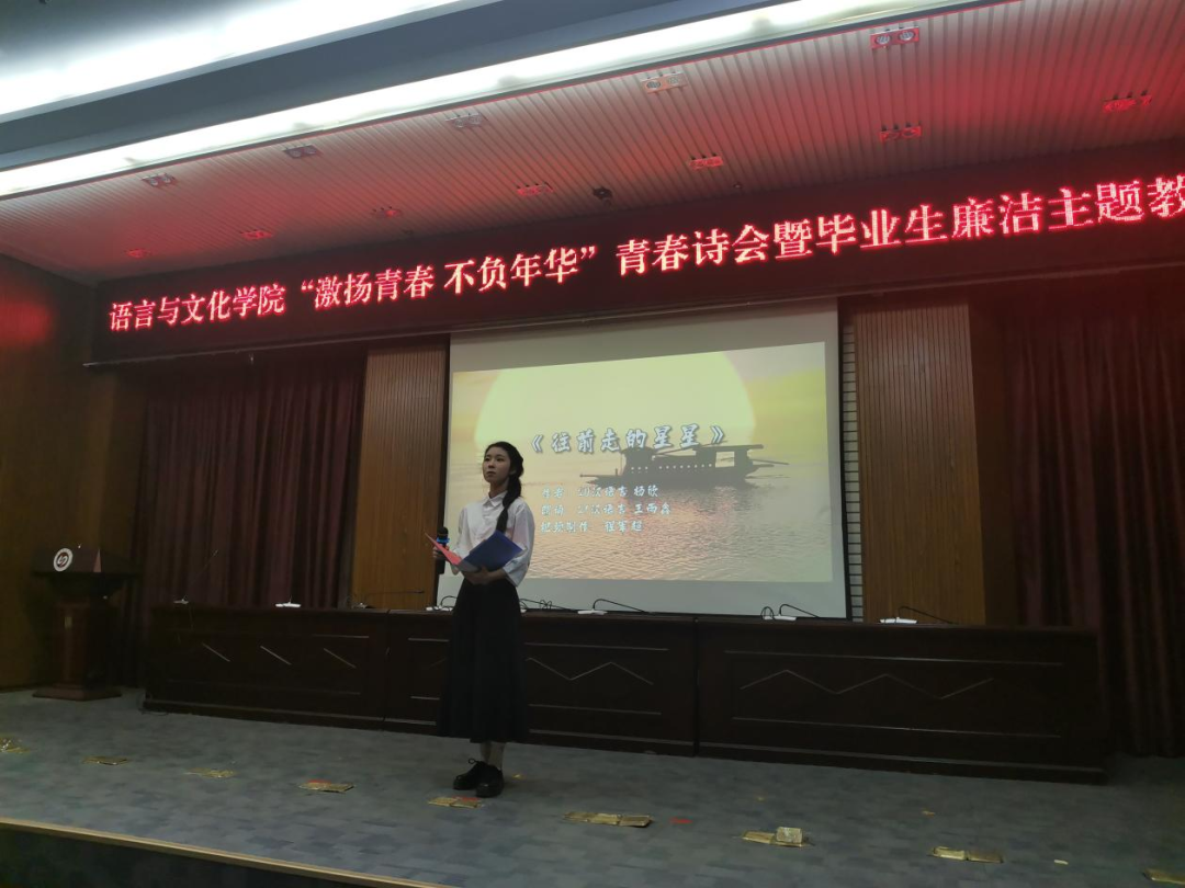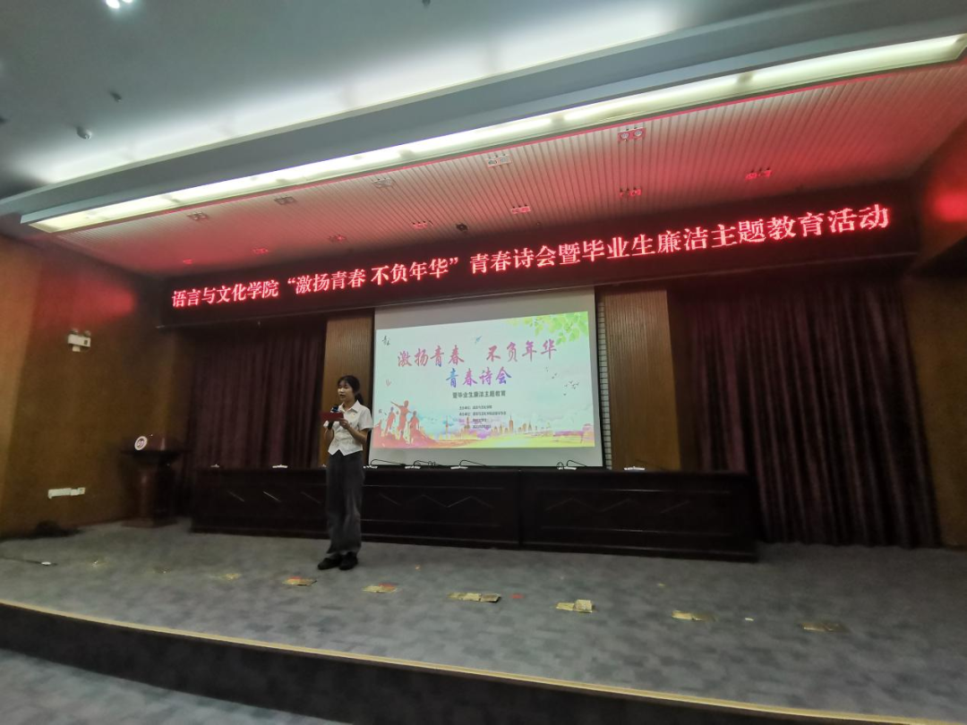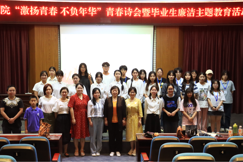 为更好在主题教育中推动我院青年师生深入学习贯彻习近平新时代中国特色社会主义思想,做好毕业生离校前廉洁教育,6月10日晚,语言与文化学院在行政楼报告厅举办以“激扬青春 不负年华”为主题的青春诗会暨毕业生廉洁主题教育活动。院党委书记张晓芳、院党委副书记陶莉、院团委书记元佳珺、鹤鸣文学社指导教师许陈颖、辅导员林猤、姜婷婷、李雪、江培春出席本次活动。