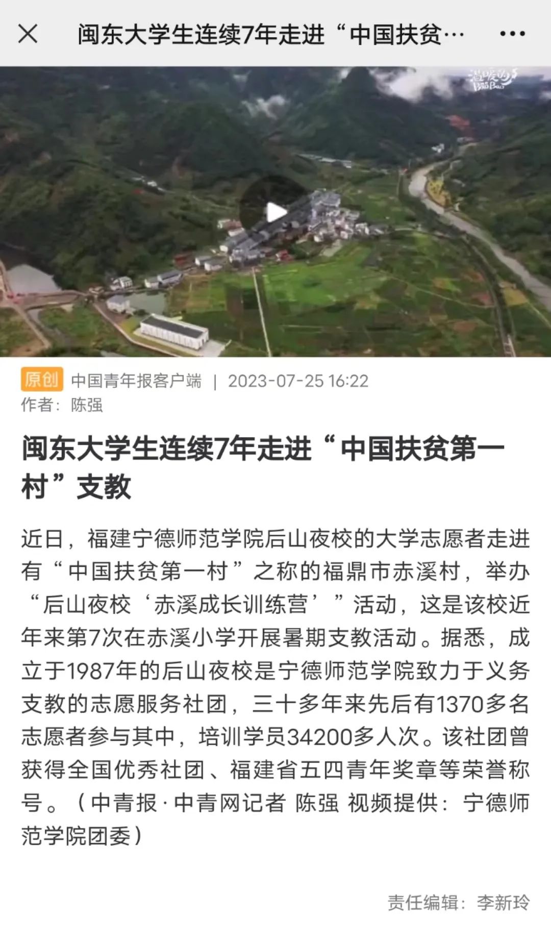 日前,中国青年报客户端报道了我校后山夜校大学生志愿者连续七年走进中国扶贫第一村爱心支教,播撒希望、传递爱心。