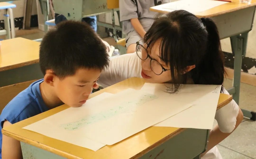 实践队队员蔡钰欣正在耐心地辅导学生绘画