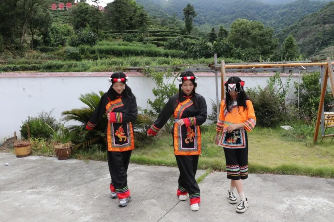 实践队队员与当地孩子一起学习畲族舞蹈