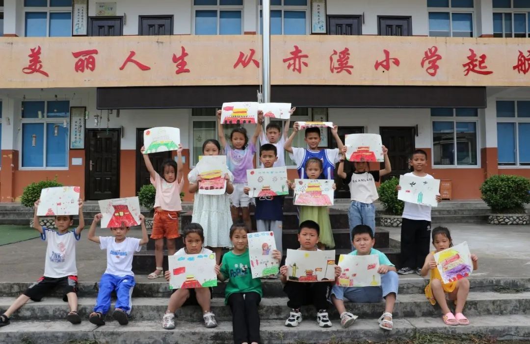 低年级的孩子们举着自己“心目中的祖国”绘画作品在国旗台前合照