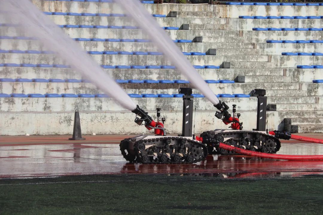 2 名消防员操作着2台消防机器人,演示如何使用消防机器人替代消防员进行内攻灭火;再由 2 名消防员操作 2 架无人机,演示无人机在水域救援中如何发挥作用。此项救援演示向大家展示了高科技与消防救援相结合作用的结果,通过运用科技的成果,更好开展救援活动。