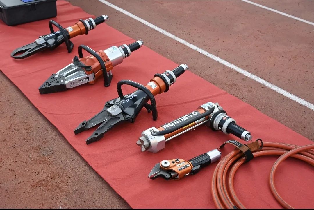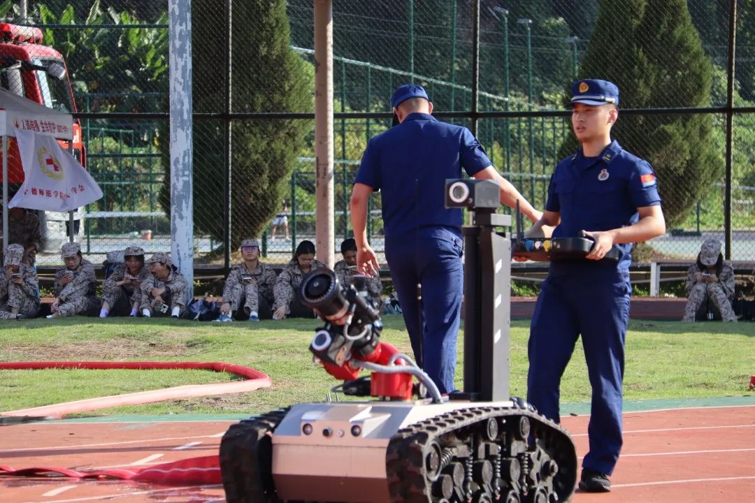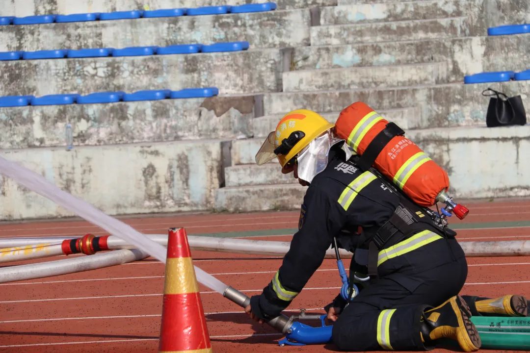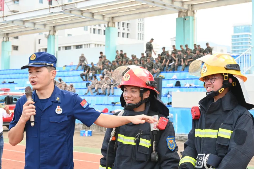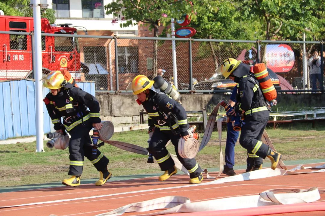 技能展示由 8 名消防员演示消防业务技能——枪炮协同灭火操。展示过程中,消防员之间默契配合,先架设水炮冷却压制火势,再铺设两支水枪交替掩护,进一步接近火点,近战灭火。消防员的灭火速度之快,动作之熟练,让台下师生无一不流露惊叹之色。