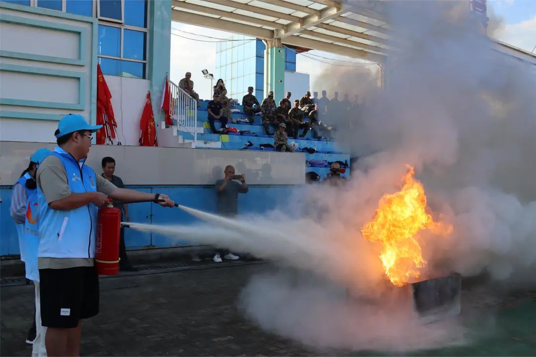 消防员油盆灭火区给大家讲解示范如何正确使用灭火器,并组织部分学生代表参与初起火灾扑救,协助他们掌握常用消防器材的使用方法,期间邀请学校 6 名消防志愿者配合演练。在消防队员与学生代表的默契配合下,消防实践演练成功落幕。