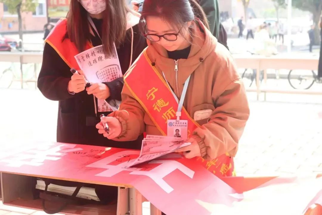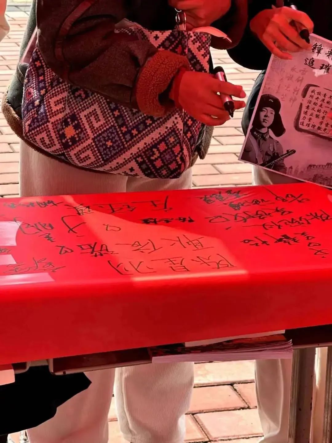 “我将积极的参与到志愿服务当中去,弘扬雷锋精神。”在校园的另一侧,同样是一幅热火朝天的景象,志愿者们正在排成整齐的队伍,依次走向道路中央的签字墙前,留下自己的誓言与姓名。
