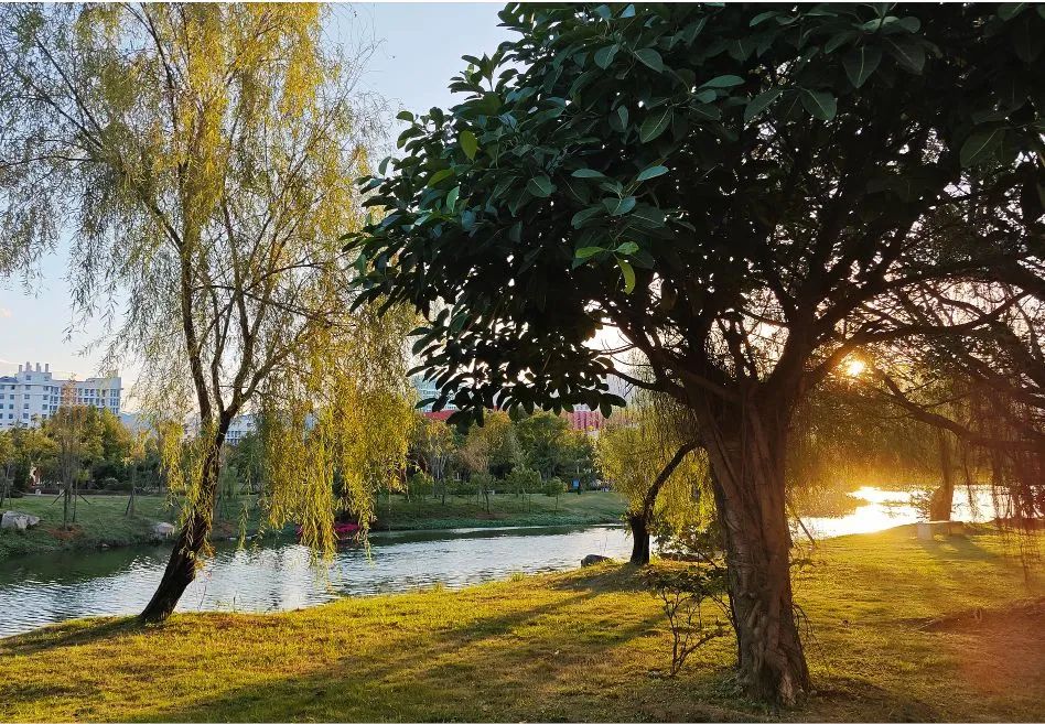 傍晚时分最爱到湖边散步,风吹过,树梢就摇曳起来,茵茵绿草也泛起波浪,走在湖边的我就雀跃起来,看着夕阳落山,仿佛这一天好的坏的也随之过去了。