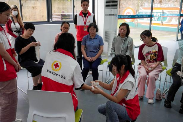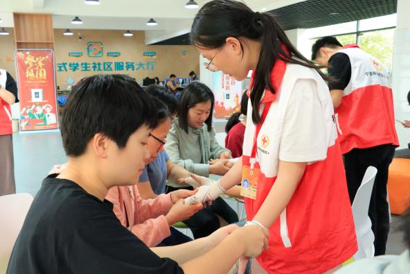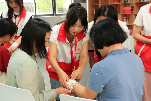 “不同的受伤部位适用不同的包扎手法,如环形包扎法,适用于手臂、腿部等部位的伤口包扎,包扎松紧要适宜,太紧会影响血液循环,太松敷料容易脱落或移动。”4月16日,宁德师院团委与校工会在学校一站式学生社区服务大厅共同举办师生救护技能培训活动。活动现场,校红十字会的志愿者讲解常规急救和包扎技能,针对受伤部位不同,展示了环形绷带包扎法、螺旋绷带包扎法、螺旋反折法以及八字绷带包扎法等。