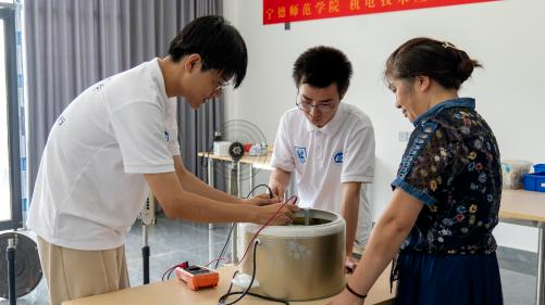 7月7日开始,机电工程学院的大学生志愿者们在霞浦县柏洋乡董墩村开展为期半个月的“义务维修、爱心支教”志愿服务活动。维修区摆满了村民送来各种待维修的小家电,大学生们仔细检查每件物品,分工协作,有的拆解,有的忙着检测。村民江燕燕家的电热水壶不通电了,不到半个小时,大学生们便找到了原因,“自动断电开关坏了,用电烙铁焊接上就可以了”,江燕燕竖起大拇指给同学们点赞。