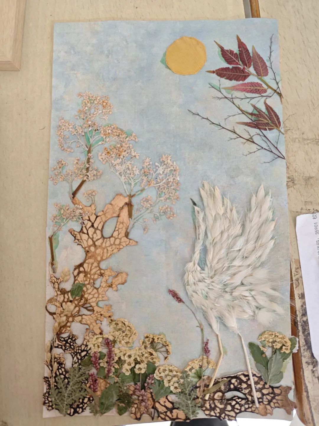 创意组围绕“中国传统节日”主题进行创作,除扇子等作品外,更有选手以枫叶、银杏叶为元素,拼贴出“中秋赏月”场景,圆月、桂树与人物形态栩栩如生,将传统节日氛围与植物美学巧妙融合。活动通过植物创作激发创新思维,引导学生关注生态保护,践行“春耕启智计划”的育人使命。