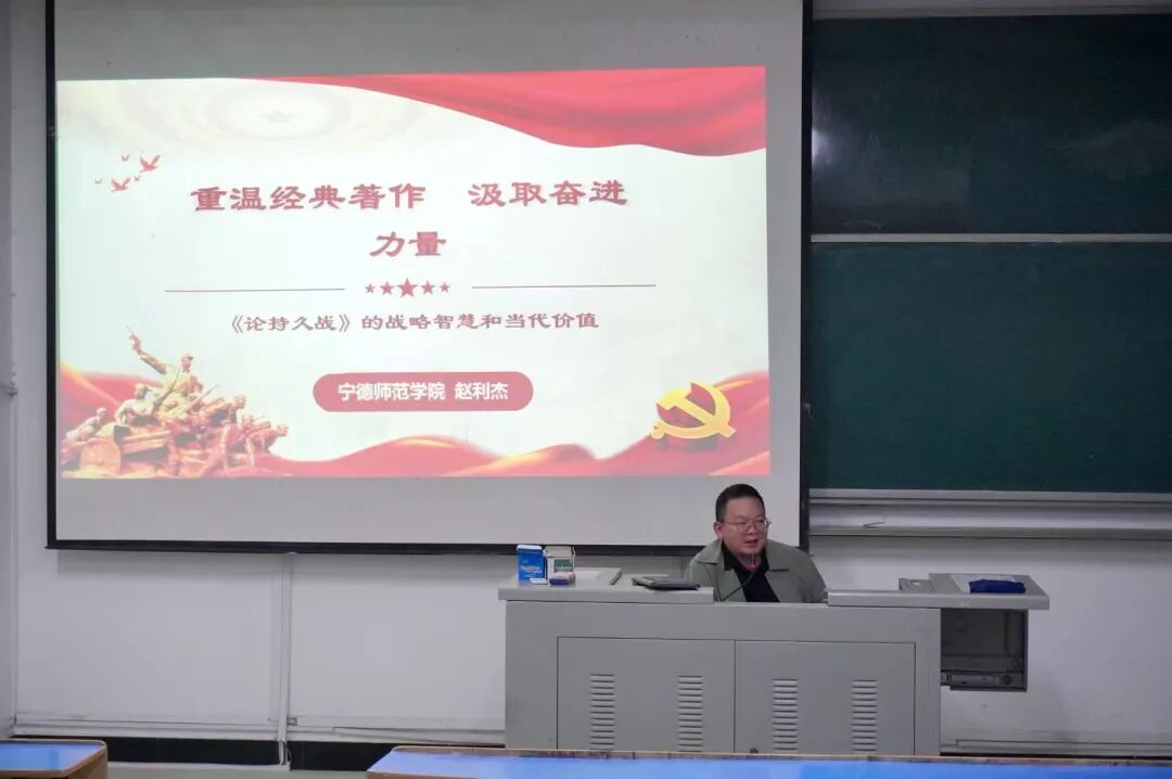 为深入学习贯彻习近平总书记在纪念中国人民抗日战争暨世界反法西斯战争胜利80周年大会上的重要讲话精神,弘扬伟大抗战精神,准确把握《论持久战》跨越时代的思想内核,在重温经典著作中感悟思想伟力。11月4日下午,我校“青马工程”大学生骨干班和“读书社”在求知楼B201开展“《论持久战》的战略智慧与当代价值”主题讲座。本次讲座由马克思主义学院赵利杰副教授主讲,第十四期“青马工程”大学生骨干班、“读书社”认真聆听此次讲座。