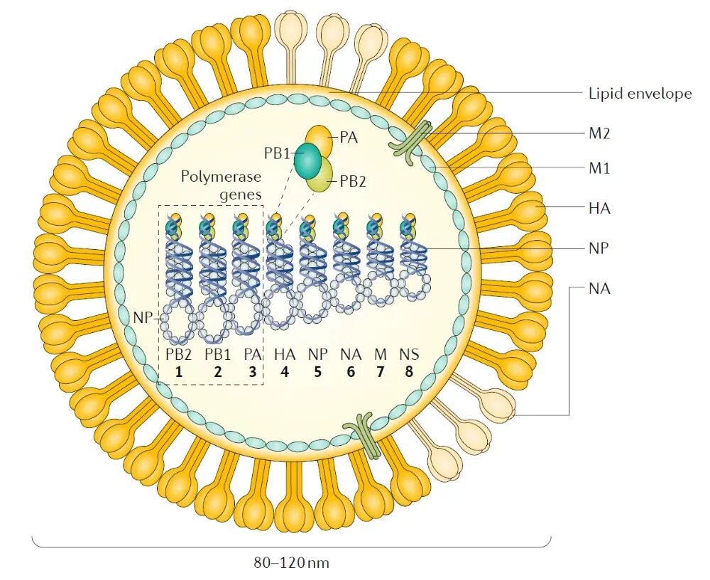 流感病毒一般呈球形,直径为80~120nm,内含7个或8个基因节段,可以分为甲(A)、乙(B)、丙(C)、丁(D)四个型别。