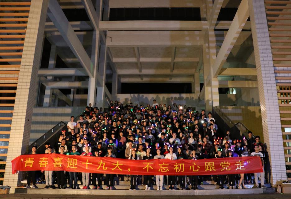 本次荧光夜跑活动的口号是“青春喜迎十九大,不忘初心跟党走”,同学们头戴荧光牛角头饰,手戴彩色荧光手环与发光指环,在夜色的映衬下,形成了一道靓丽的风景线。