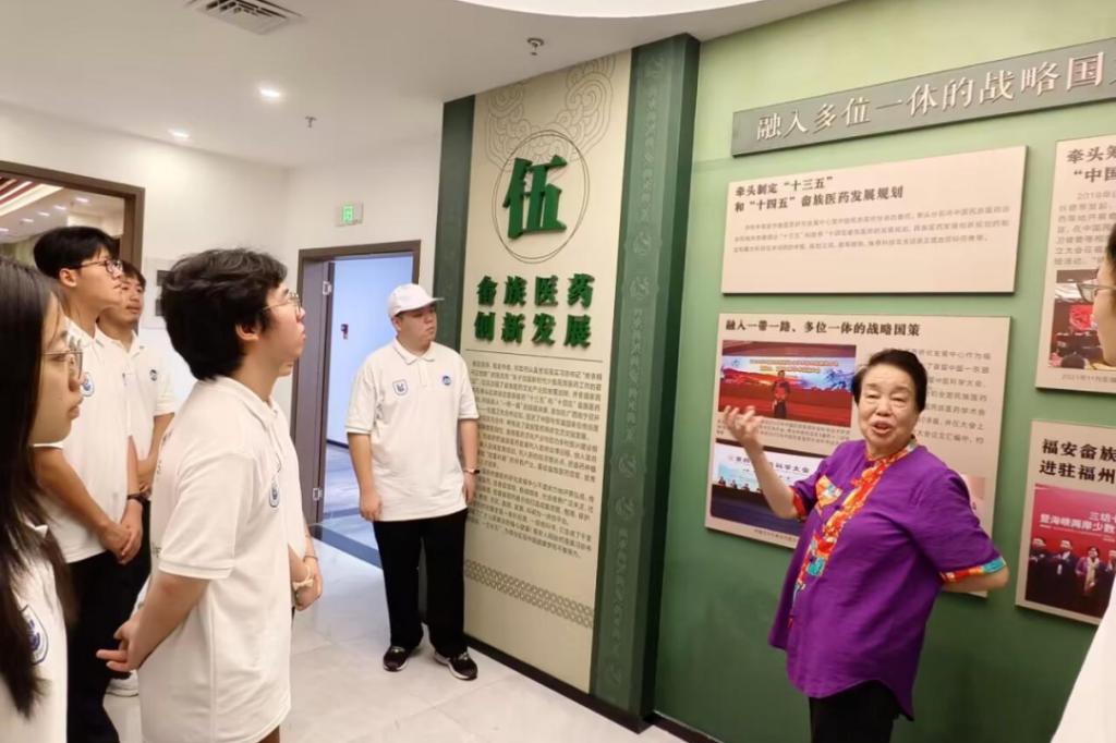 展厅内,“融入多位一体的战略国策”相关展区尤为引人关注。多年来,福安市畲医药研究发展中心牵头制定“十三五”和“十四五”畲族医药发展规划,将畲族医药文化产业与助力乡村振兴建设相结合,重视畲族医药领军、优秀和确有专长人才培养,为畲医药资源的保护利用及校园非遗文化传播注入源源不断的青年力量。