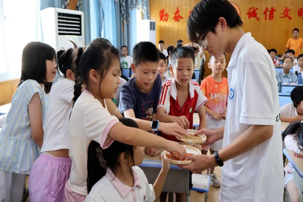 图为学生们积极通过触感认识五谷
