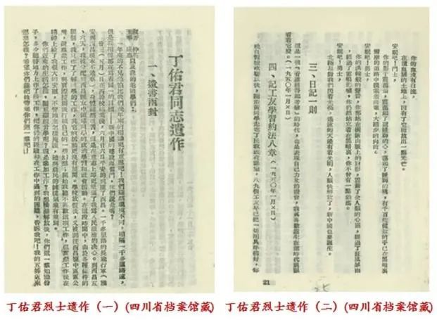 在四川省档案馆,珍藏着丁佑君烈士的系列档案:《丁佑君烈士纪念册》《安葬丁佑君烈士纪念册》《纪念丁佑君的报纸和剪贴》《青年团西康省工委关于安葬丁佑君烈士的启示和追悼会的照片》以及连环图书《丁佑君》。这些珍贵的档案详实记录了丁佑君短暂而伟大的一生。