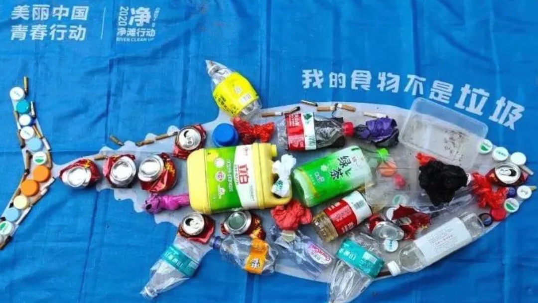 颍泉河边,来自安徽阜阳的“河小青”们,把从河道边捡拾到的一百公斤垃圾进行了数据记录,并拼出了一条“垃圾鱼”的图案,以此警醒河流垃圾对水生生物的影响与危害。