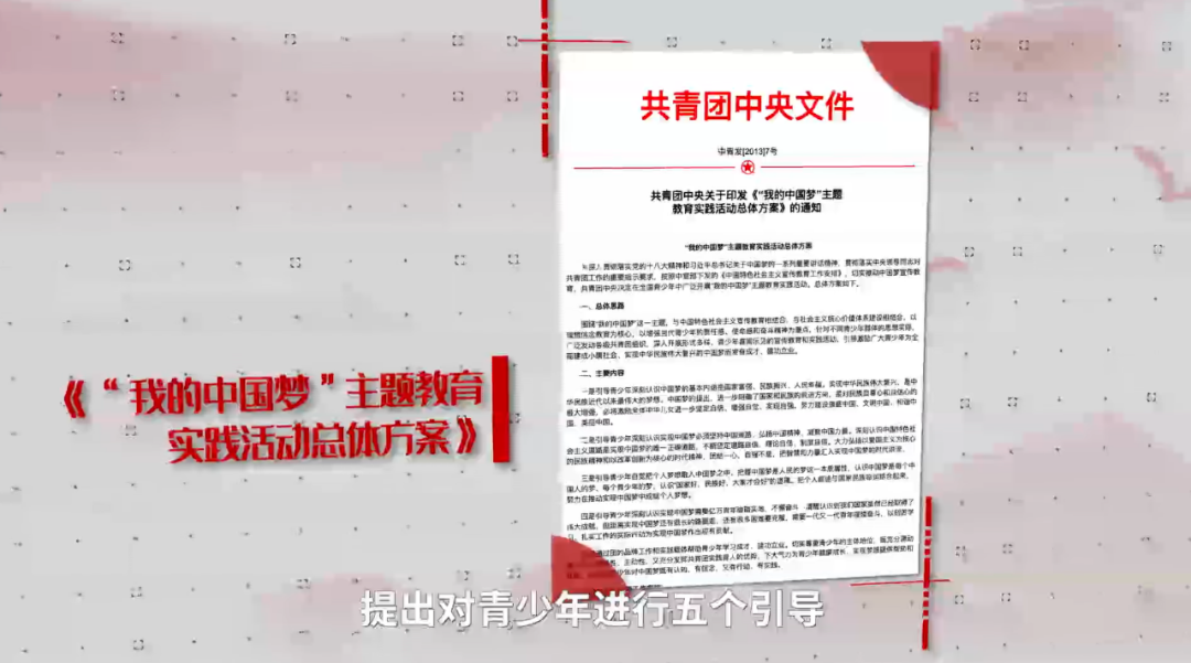 为深入贯彻落实习近平总书记关于“中国梦”的重要讲话精神,贯彻落实中央领导同志对共青团工作的重要指示要求,2013年4月,团中央印发《“我的中国梦”主题教育实践活动总体方案》,部署在全国青少年中广泛开展“我的中国梦”主题教育实践活动。并且在活动内容上,提出对青少年进行五个引导。