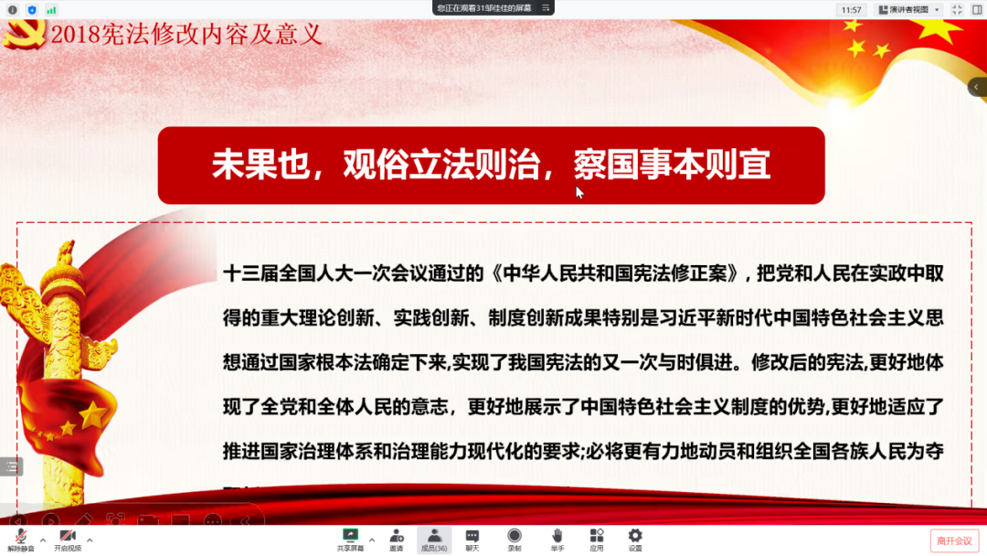 秉着认真学习宣传贯彻党的二十大精神,深入学习贯彻习近平总书记法治思想,响应我校“学习宣传宪法、弘扬宪法精神、维护宪法权威”的号召,智能电网21级(1)班于2022年11月29日线上开展了“宪法宣传周”主题班会。