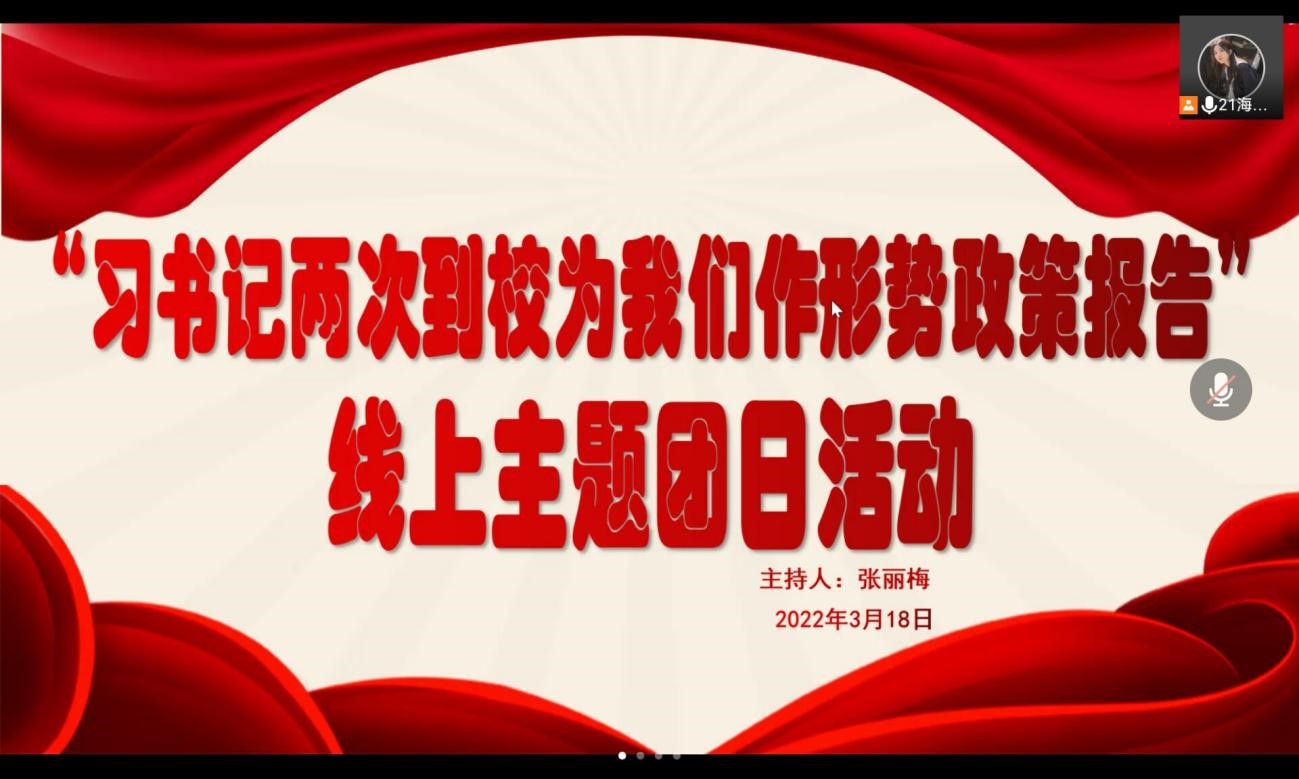 通过学习习近平总书记多年来与大学生之间的生动故事,2021级海洋资源开发技术1班团支部深刻感悟了习近平总书记关于青年工作的重要思想的热情关怀和以习近平同志为核心的党中央对青年学生的期望和要求。为了努力成长为德智体美劳全面发展的社会主义建设者和接班人,21海洋班于2022年3月18日开展学习“习书记两次到校为我们作形式政策报告”线上主题团日活动。