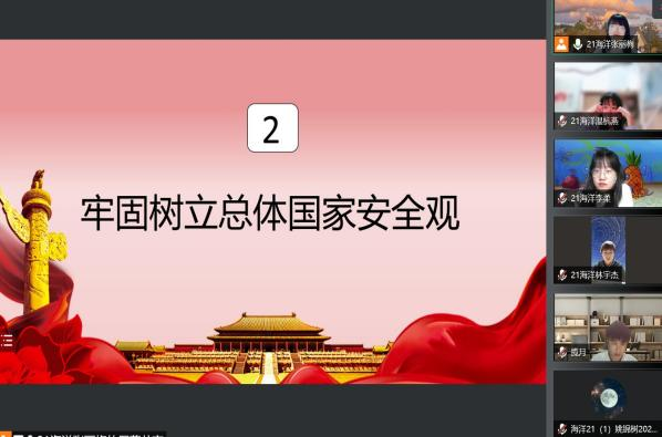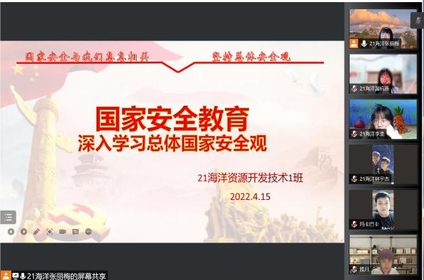 为贯彻落实习近平总书记提出的“总体国家安全观”,提高同学们维护国家安全的法律意识。通过全民国家安全教育日的一系列活动,可以让我们更高效地了解国家安全法提出的各项要求,从而强化责任意识,提高大家维护国家安全的能力。21级海洋资源开发技术1班团支部于2022年4月15日举办“千万师生同上一堂国家安全教育课”线上主题班会。