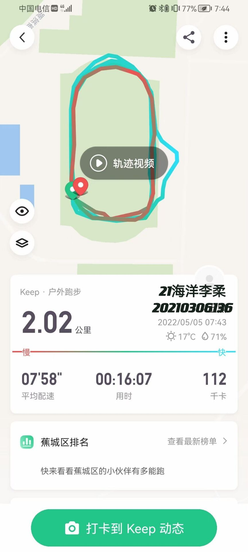 本次活动地点于我校操场,由体育委员卢镛州主办,活动主要面向海洋班全体成员,同时,在本次活动中同学们能够通过公里数达标赢得奖品,比如:前三位公里数达到10公里的同学,可以领取奖品一份。在活动开始后,活动参与的同学用keep这一APP进行打卡,并截图。