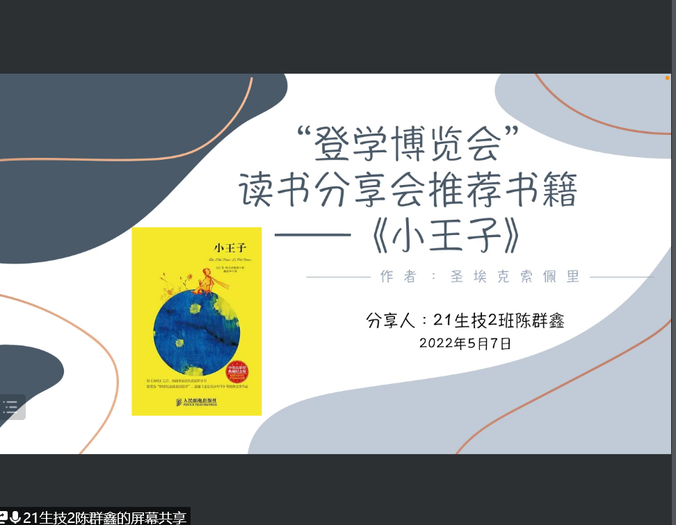 作为知识的载体,书籍也是人类记忆和想象的延伸。品一本好书,如同于一位智者对话,在疫情之下为了让同学们在读书中领悟真谛,在分享书籍中传达知识获得共鸣,2021级生技2班团支部特开展主题为“登学博览”读书分享会活动。