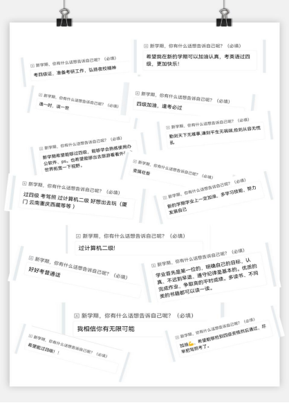 春回大地,兔跃青山。在这柳枝吐翠的时节,我们和春风一起踏上返校之路,在这充满希望的新年里,我们带着对新时光的展望与期待“全新开始”,逐梦我们新学期的征程,开启求知生涯的又一个里程碑。为激发支部成员对新学期的期待与热情,打造积极向上的支部氛围,2022级食品科学与工程2班团支部以“全新开始”为主题,向支部成员发起号召,让大家说出自己对新学期的新寄语新目标,做到新学期有目标有动力。