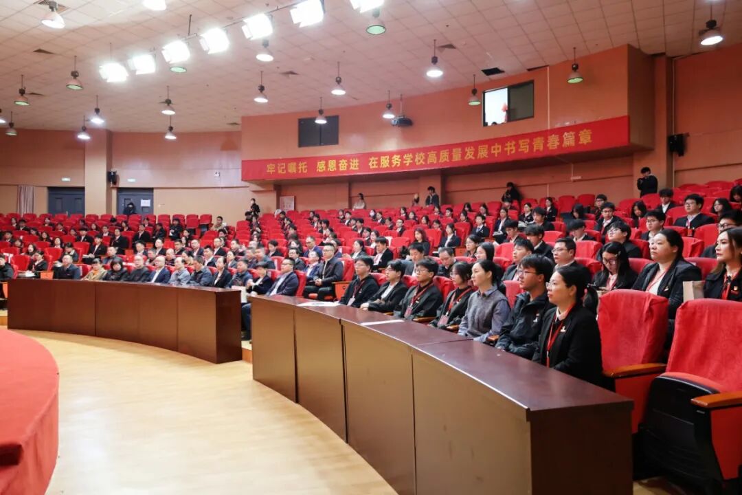 会场气氛庄严热烈,“牢记嘱托 感恩奋进,在服务学校高质量发展中书写青春篇章”的横幅标语鼓舞人心、催人奋进。