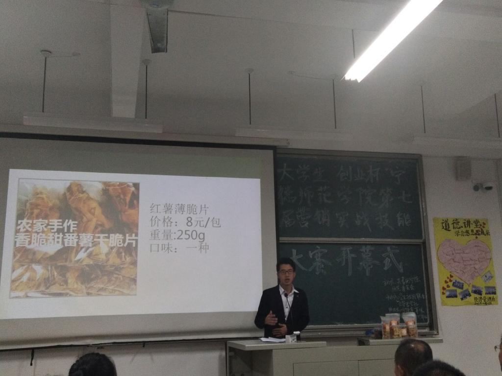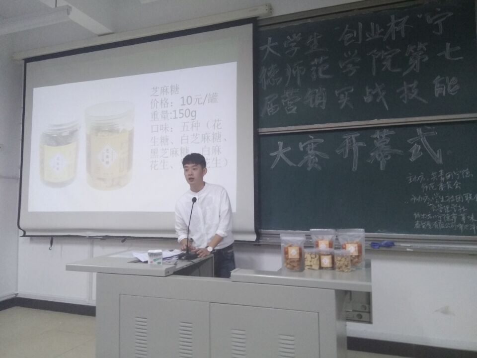 本次营销大赛开幕式由社长陈倩主持,起初游国斌院长致辞此次营销大赛,表达对这次营销大赛开展的美好祝愿。接着由公司负责人钟立用PPT讲解莘味泰贸易有限公司所销售产品的介绍,以及进行对现场同学们关于产品问题的答疑解惑,之后由游天嘉老师上台详细讲解营销策划书的书写方法并祝愿每个参赛队伍都能取得优秀成绩。最后欧洋婷老师为我们讲述市场调查,为同学们明确市场调查的方式。