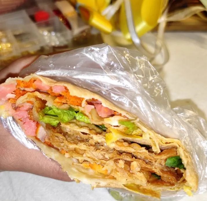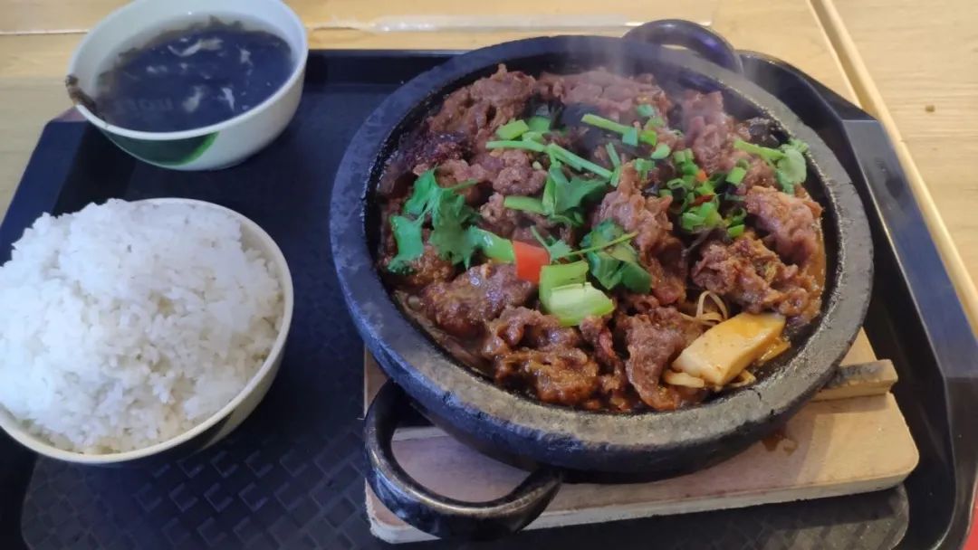 分量很足,可以从午饭吃到晚饭,老板人超nice,可以让他给你的饭上淋一勺西红柿鸡蛋。配料有:小肉肠、土豆片、包菜,偶尔会附赠肉丸汤。
