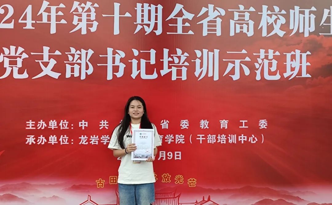 她以优异成绩通过了第十期全省高校学生党支部书记培训示范班的政治淬炼;在实践担当中,她担任学院团委副书记时积极践行服务宗旨,覆盖了300余名团员青年,发展了28名新团员;作为支部骨干完成30余名党员发展工作。