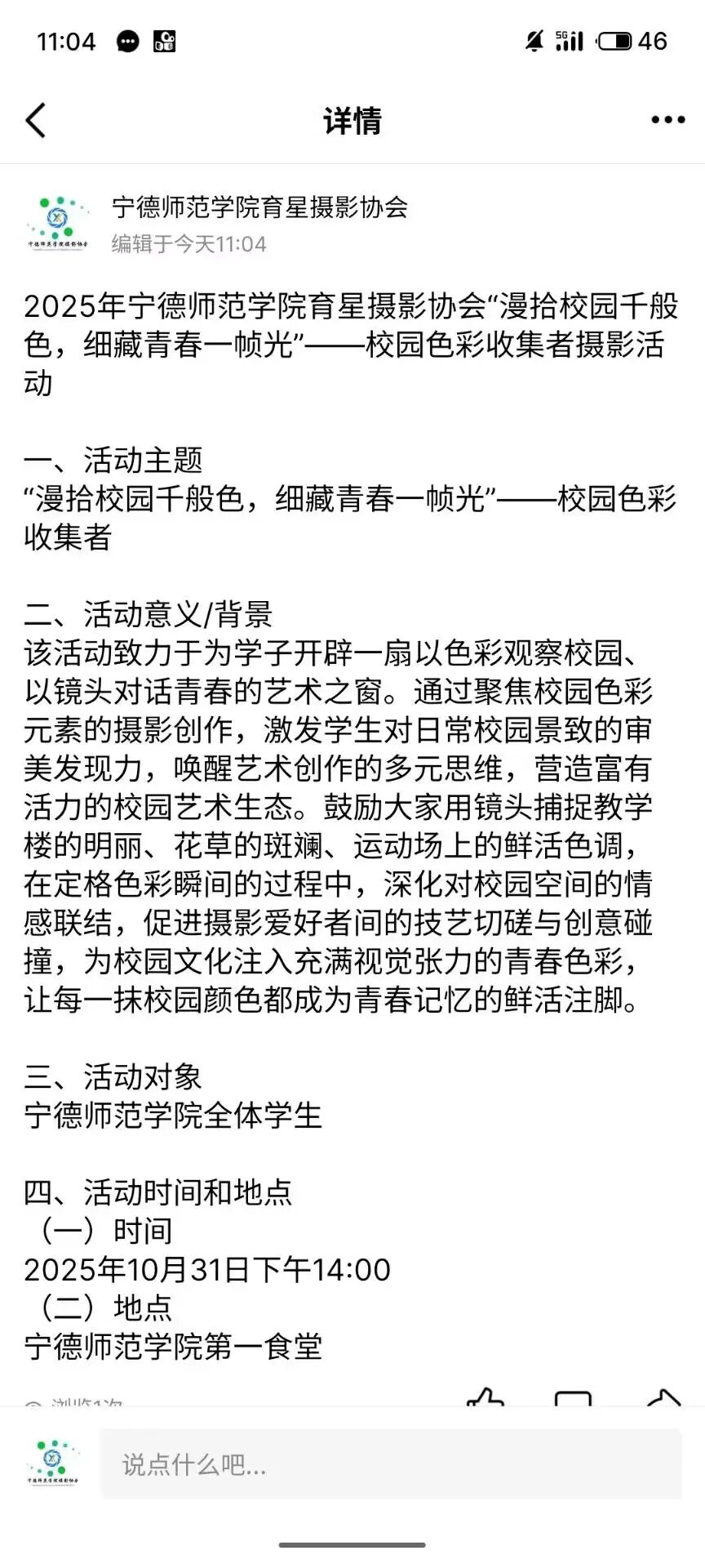 10月31日,由共青团宁德师范学院委员会主办,宁德师范学院育星摄影协会承办的“漫拾校园千般色,细藏青春一帧光”——校园色彩收集者摄影活动在线上平台举行。