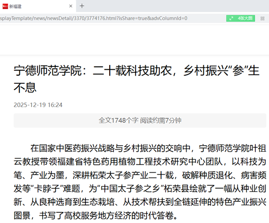 日前,学习强国福建平台、新福建等媒体平台以《宁德师范学院:二十载科技助农,乡村振兴“参”生不息》为题报道我校生物科学与工程学院叶祖云教授带领福建省特色药用植物工程技术研究中心团队,以科技为笔、产业为墨,深耕柘荣太子参产业二十载,破解种质退化、病害频发等“卡脖子”难题,为“中国太子参之乡”柘荣县绘就了一幅从种业创新、从良种选育到生态栽培、从技术帮扶到全链延伸的特色产业振兴图景,书写了高校服务地方经济的时代答卷。