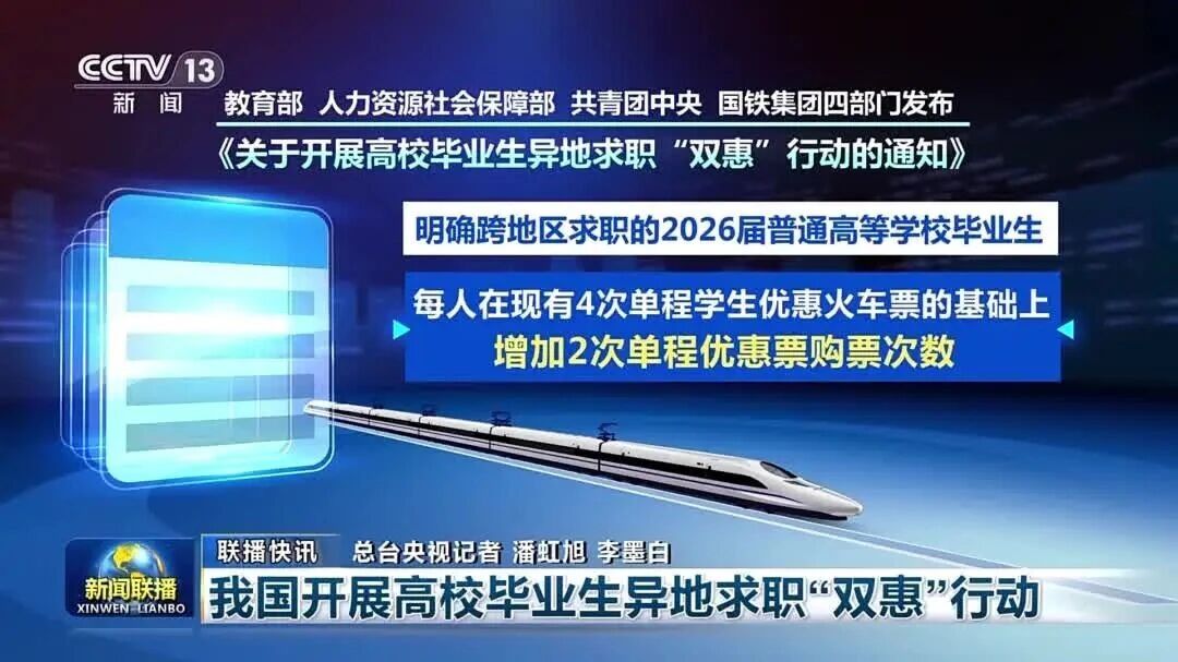 近日,教育部、人力资源社会保障部、共青团中央、国铁集团四部门联合印发《关于开展高校毕业生异地求职“双惠”行动的通知》,为2026届普通高等学校毕业生异地求职提供火车票优惠、“青年驿站”住宿优惠等便利服务。
