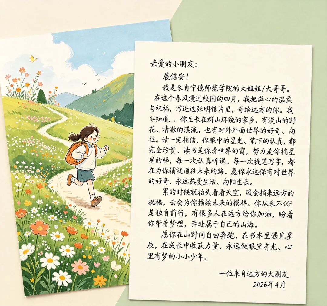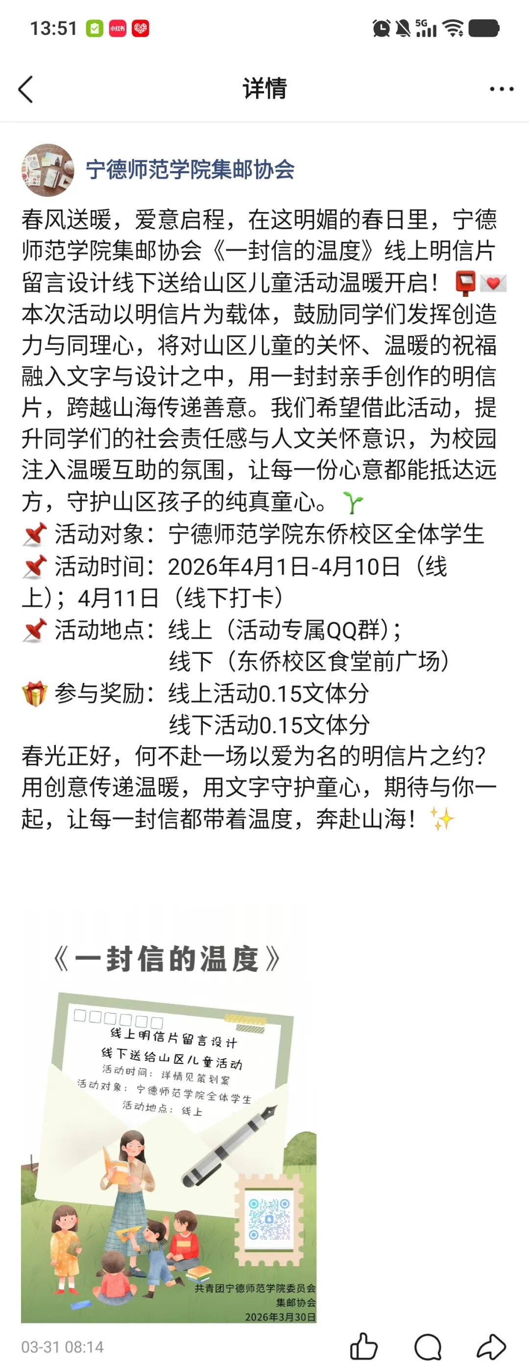 4月1日-4月10日,由共青团宁德师范学院委员会主办,集邮协会承办的《一封信的温度》线上明信片留言设计线下送给山区儿童活动在活动专属QQ群(线上)、东侨校区食堂前广场(线下)举行。