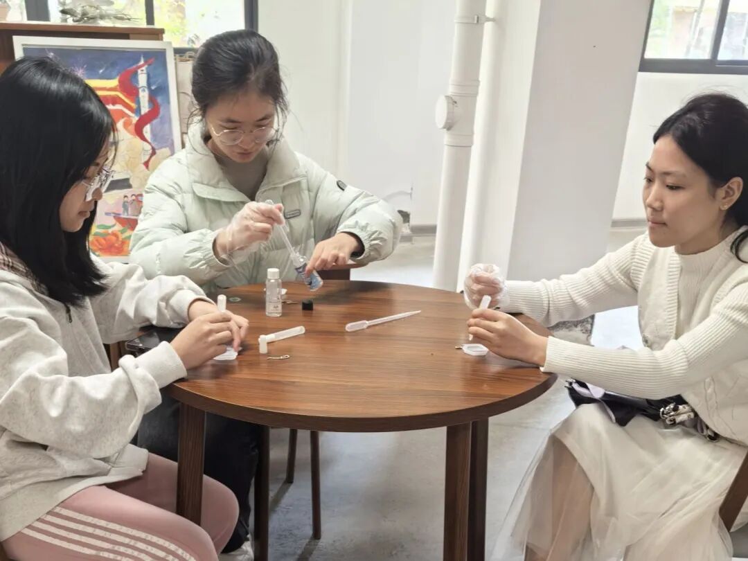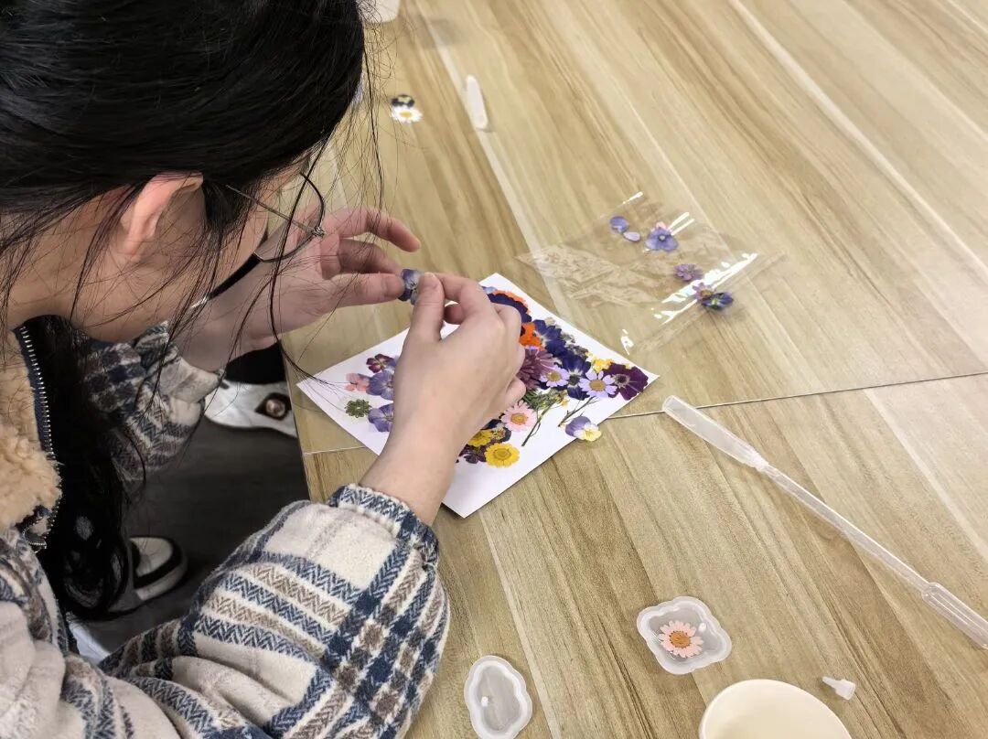 活动以干花滴胶手作制作为核心,参与者在工作人员指导下完成花材挑选、造型设计、滴胶浇筑与定型等环节,制作滴胶摆件、钥匙扣等手作,众多同学参与其中。本次活动的开展,不仅提高了学生的手工创作意识,还有利于培养学生的动手实践与审美创造的能力。同学们纷纷表示,在活动中沉浸式体验到了手工创作的乐趣,也在清和时节里感受到了以花寄思的美好情怀,收获满满。