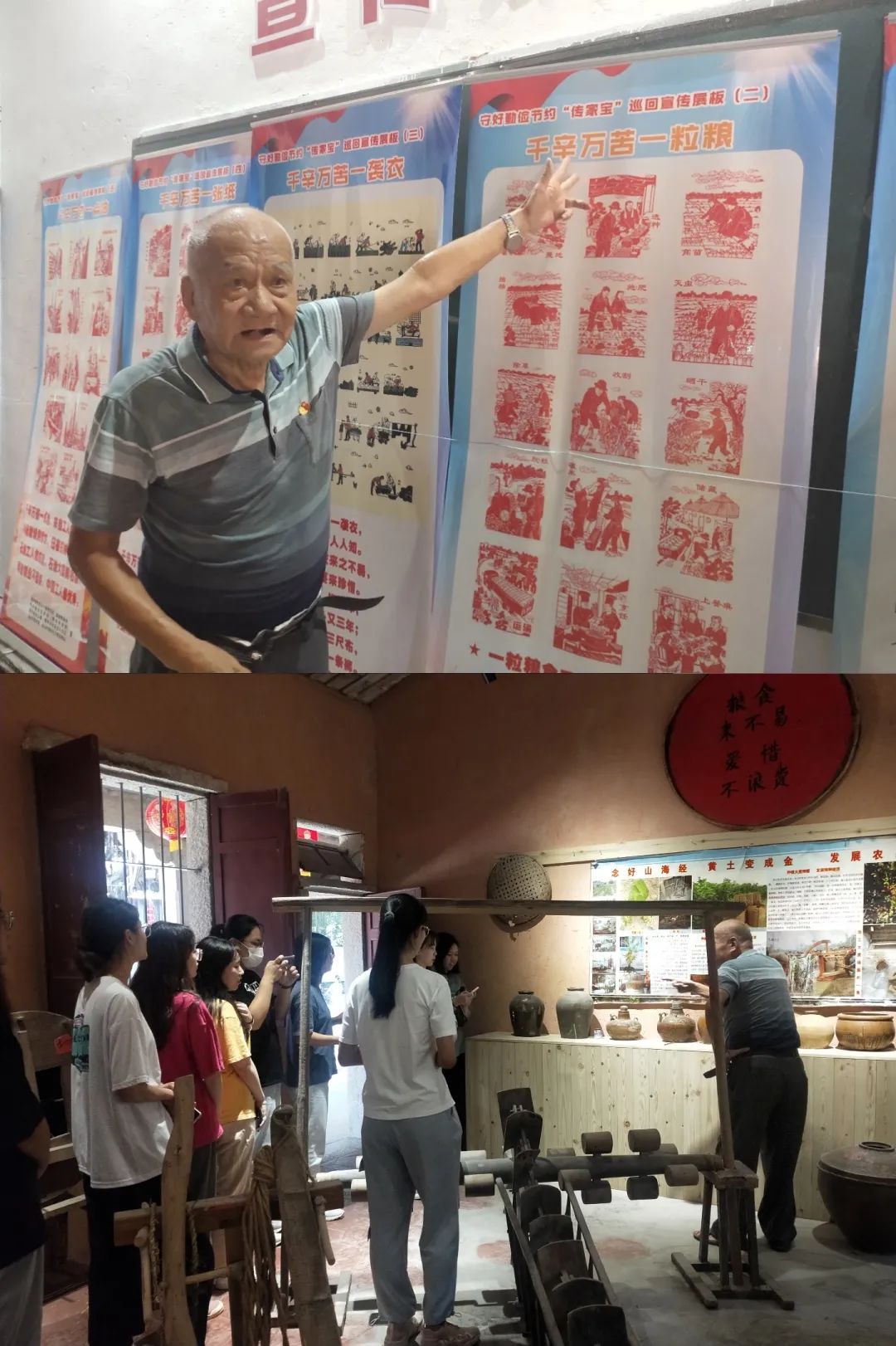以人为鉴,可以知得失;以史为鉴,可以知兴替。金山村吴金斗老先生带领团队成员走近金山村村史博物馆。一位老教师激情澎湃地向我们团队成员讲解镌刻着历史印痕的老物件、老用具。团队成员在一旁认真聆听,仔细了解。