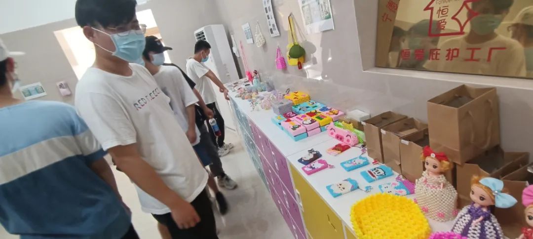 其中有一间名叫恒爱庇护工厂的房间,里面有好几个孩子正在进行手工制作。据吴主任介绍,他们都是一些身体上有障碍的孩子,虽然身体残疾,但心智却是健全的,他们也想通过自己的努力为福利院的孩子做些贡献。孩子们笑着看向实践队,不久后又埋头投入了工作中,他们制作的玩偶、手链都会通过义卖的方式换取资金,从而补贴福利院,队员们当场购买了几件,为孩子们献出了自己一点爱心。